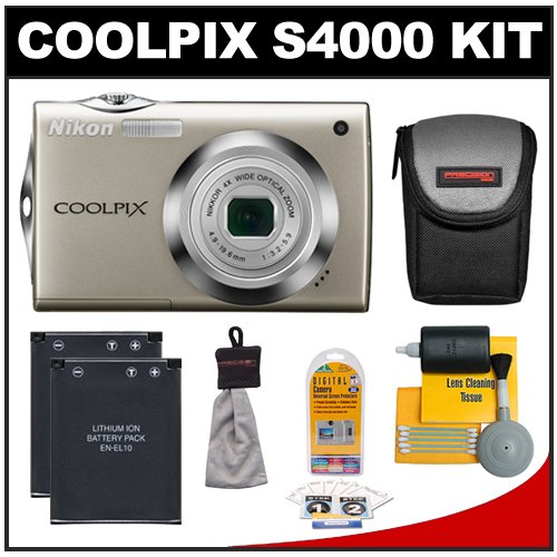 Nikon Coolpix S4000 12 MP Digital Camera with 4x Optical Zoom (Champagne Silver) + with (2) Batteries + Case + Accessory Kit Overview